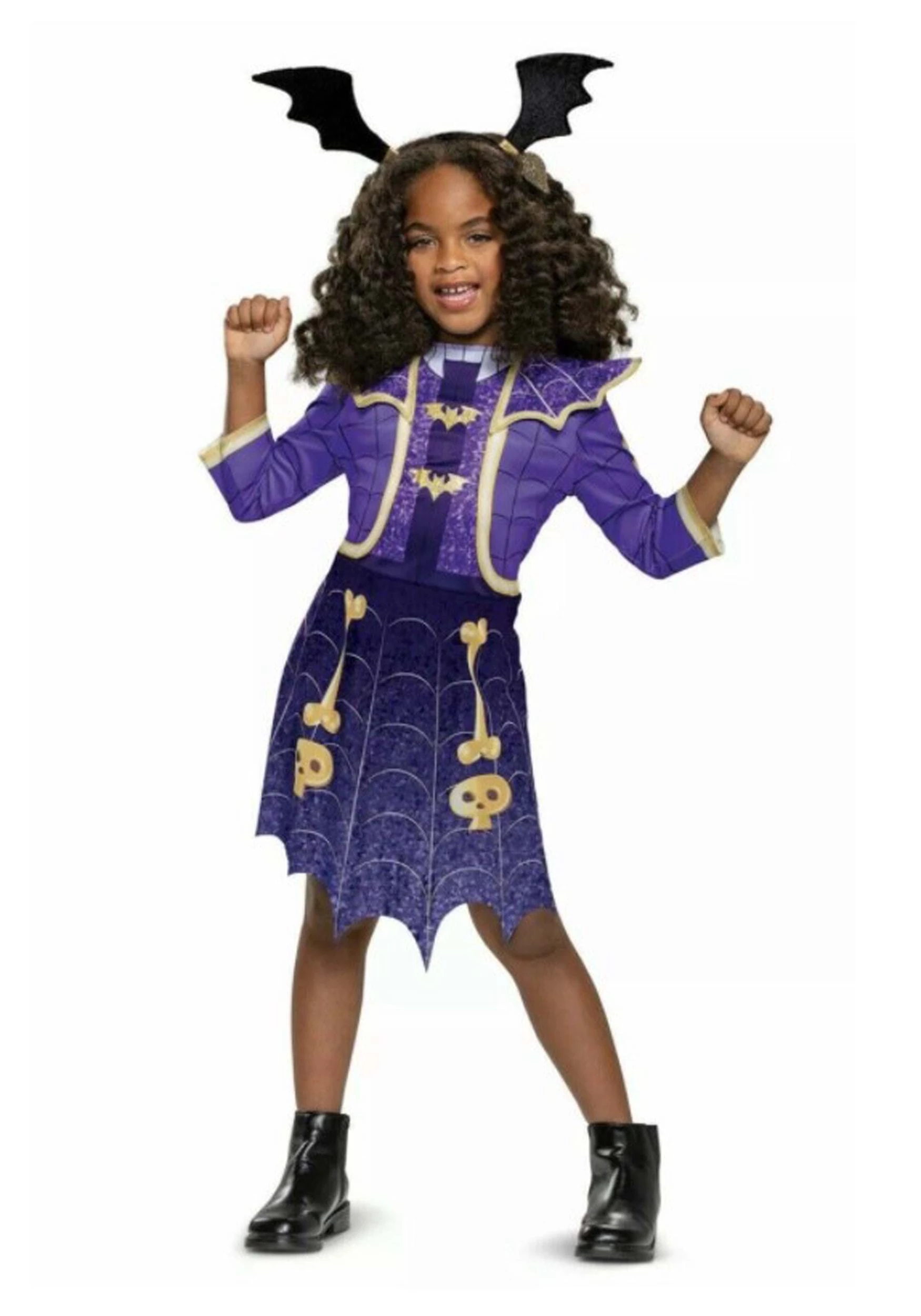 Make the transition from Transylvania to Pennsylvania look easy and awesome with this officially licensed Children’s Disney Vampirina Costume! You’ll definitely be the best dressed at your new school in a charmingly spooky purple dress with a stiffened bat-winged collar, faux-jacket detail, and a printed-on tie and bat tie clips. The three-quarter length sleeves are trimmed in gold-colored fabric to match the skull and bone detail on the skirt. The dark purple skirt’s hem has a scalloped hemline that mimics a bat’s wing and is printed with spiderweb detail. The matching headband has black bat wings.