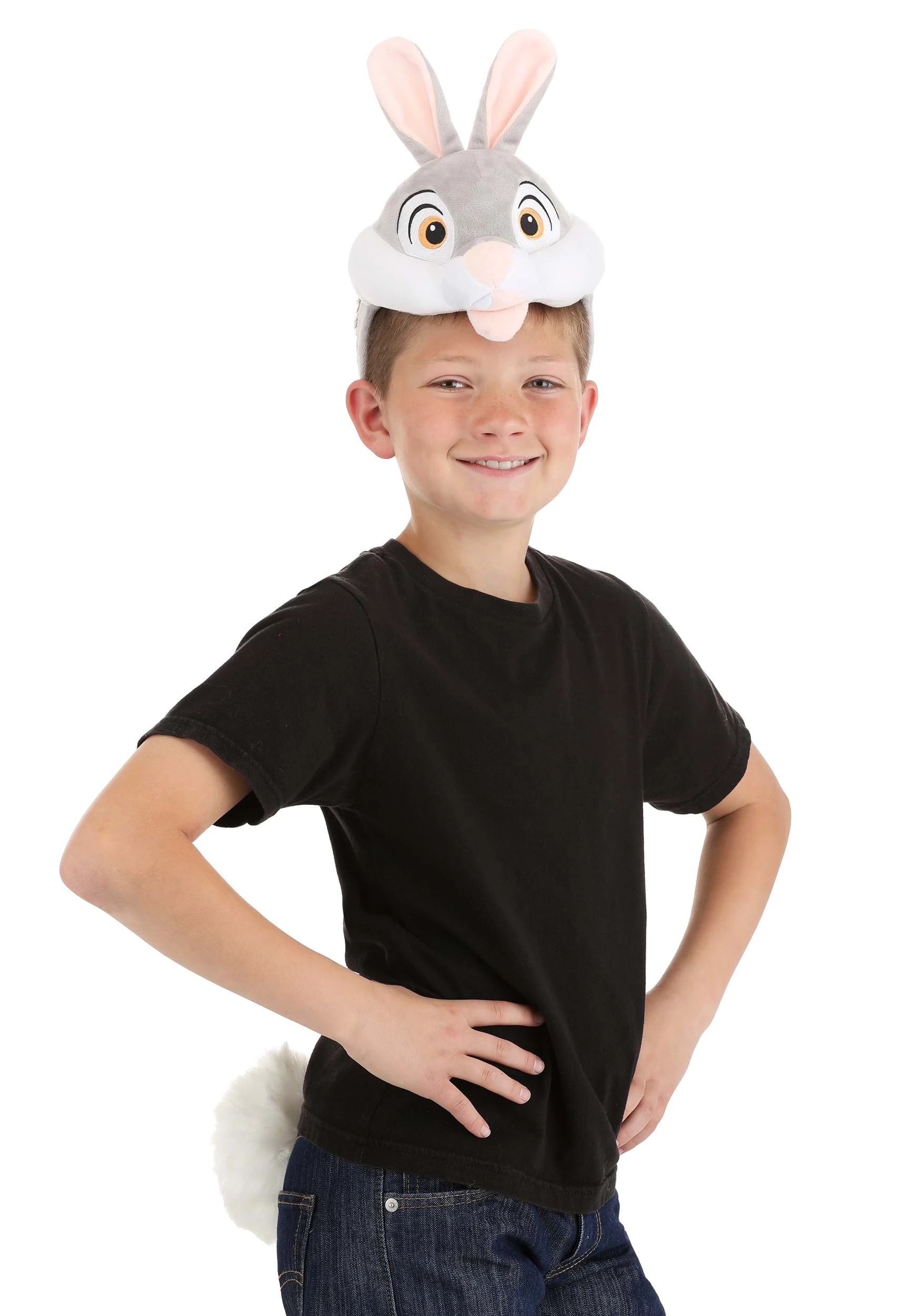 You’ll be twitterpated for this officially licensed Adult Bambi Thumper Soft Headband & Tail Costume Kit! The cloth-covered headband jas an attached face panel shaped like the upper half of Thumper’s head. Its details include embroidered eyes as well as soft-sculpted cheeks, snout and mouth, and two 3D ears lined with pink fabric. The tail is an oversized white pom-pom made of faux fur.Â