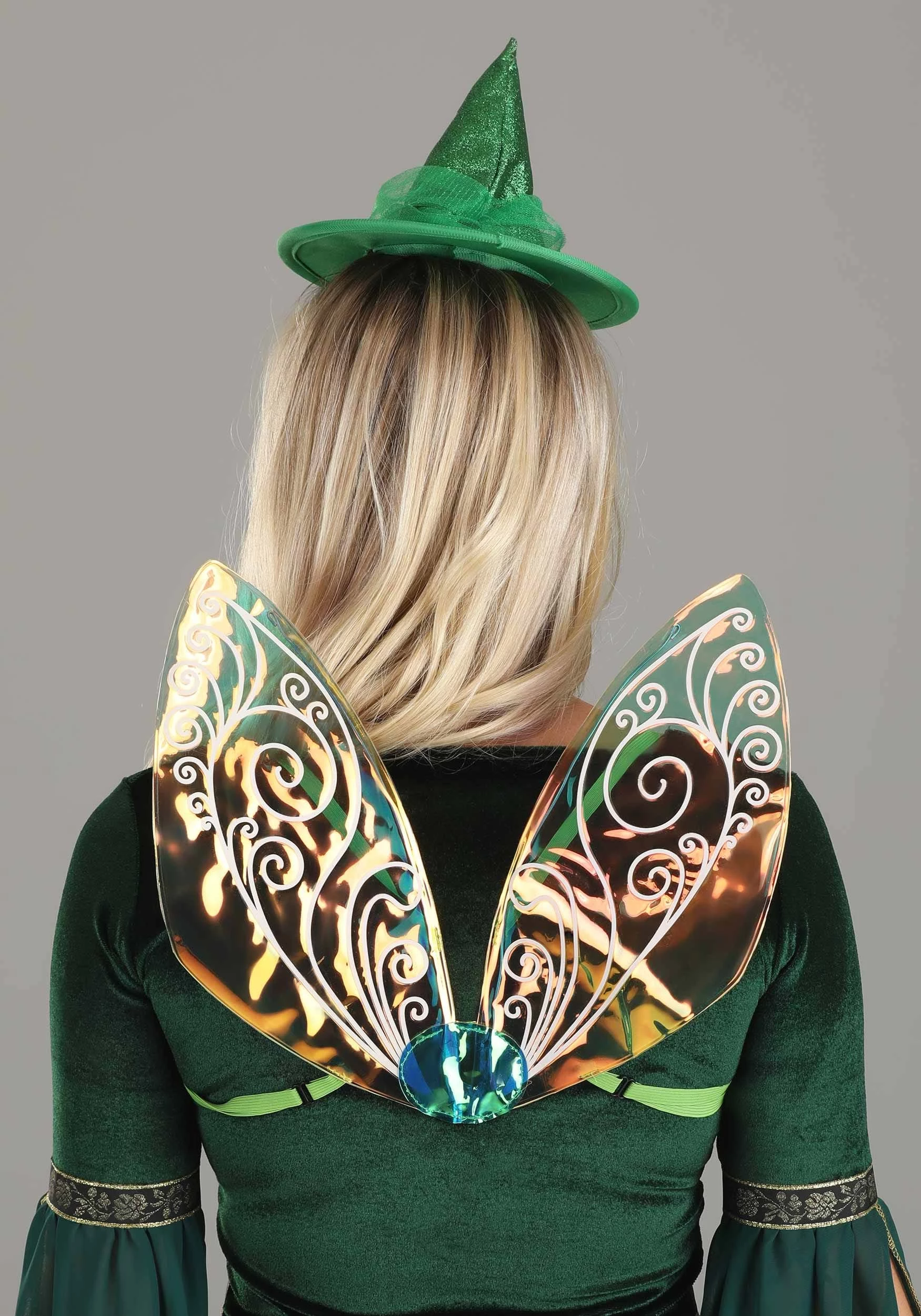 This officially licensed, exclusive Disney Fauna the Fairy Headband & Wings Kit is so pretty that it’s practically magical! A pointed hat with a sparkly crown and a wide green tulle band is attached to a cloth-covered headband so that the hat appears to float on top of your head. The gorgeous vinyl wings feature a lovely design of swirly green and gold, as well as a jewel-like green center, and loop over your shoulders via elastic straps.Â