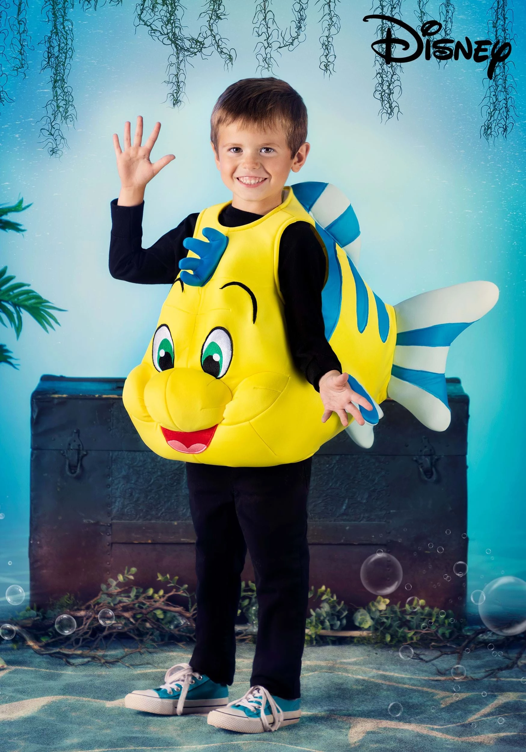 Flounder’s profile extends from the front of the tunic thanks to thoughtful sculpting achieved with fiber filling and embroidered facial features. Meanwhile, lightweight foam adds Flounder’s tail and fins to the ensemble. Spacious openings for the arms and legs allow your child to dress to their comfort and hook-and-loop fasteners secure the costume in the back.