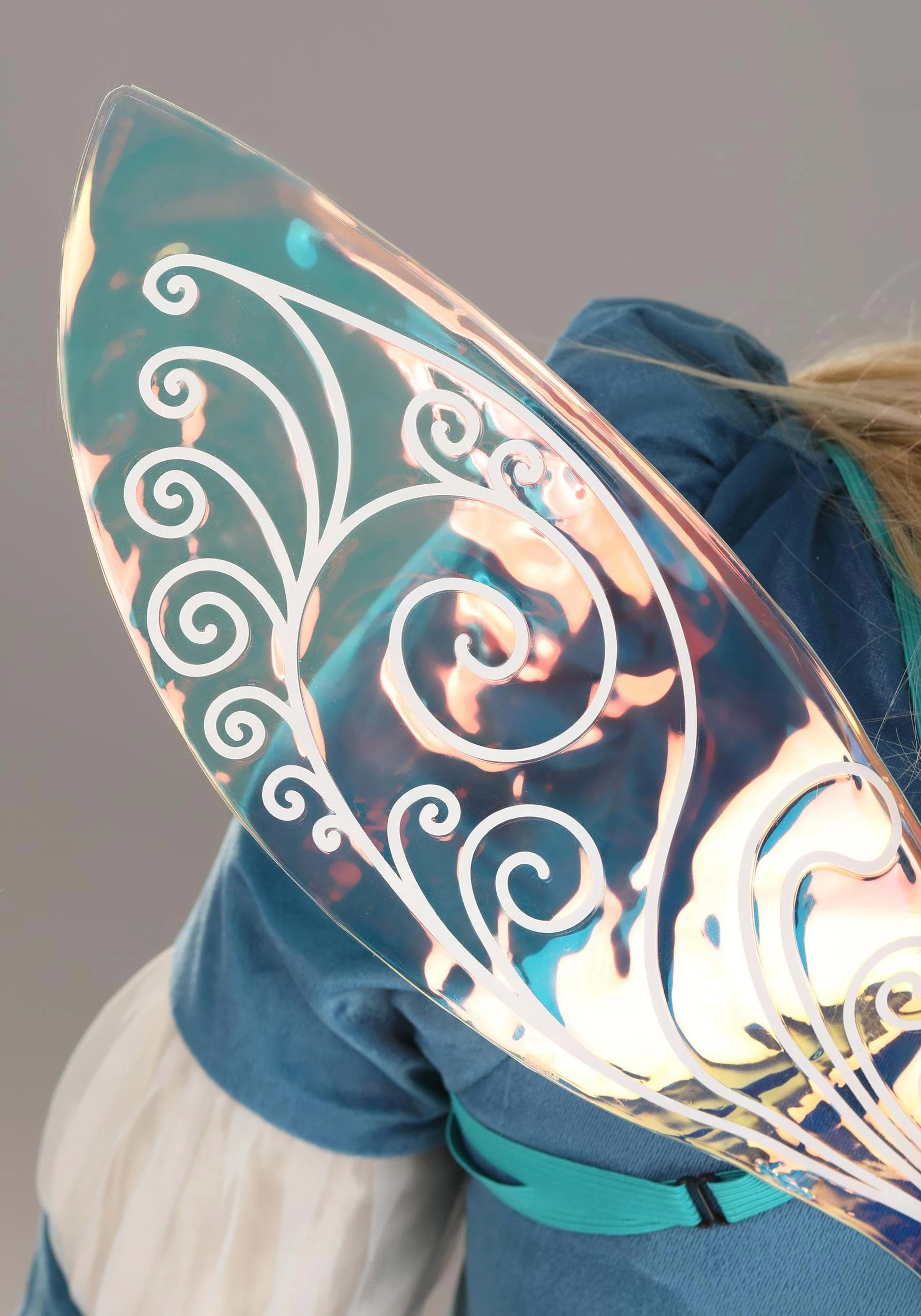 - Iridescent vinyl wings have length-adjustable elastic shoulder straps