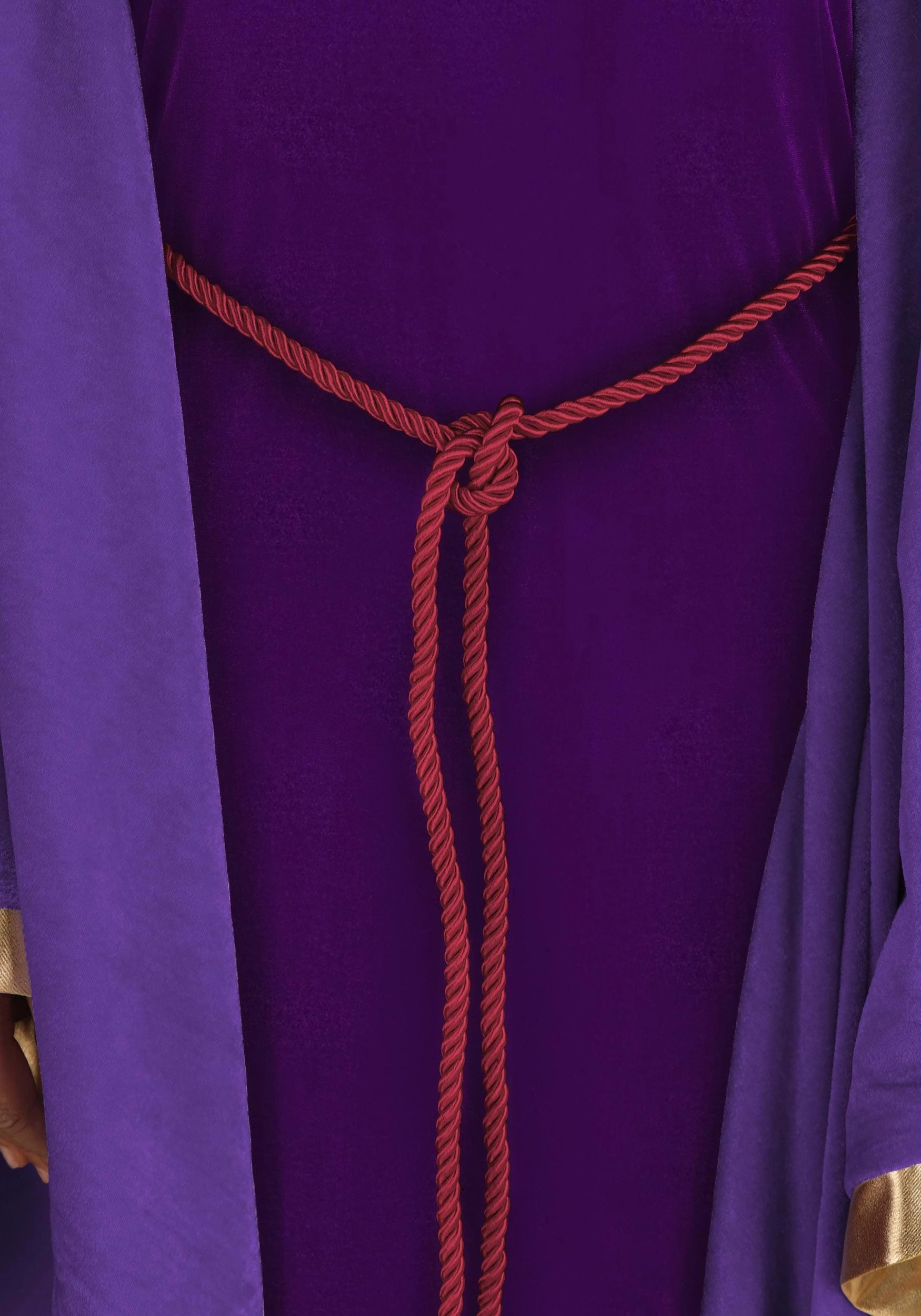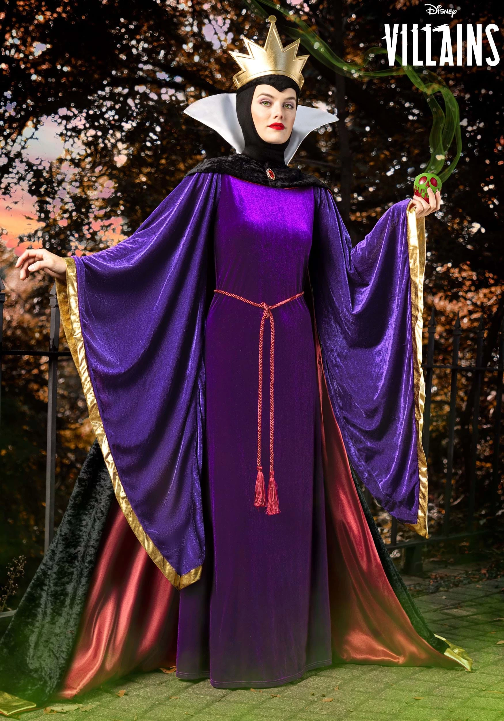 It begins with a purple gown of rich velvet, featuring oversized sleeves for the most dramatic of flourishes and a floor-length drape to draw everyone’s attention. It’s only right you be recognized! The cape is crafted of textured black and burgundy velvet with gold trim. Pin the faux ruby brooch and crown your look with the shining tiara. All you need next is to perfect your sinister smile!