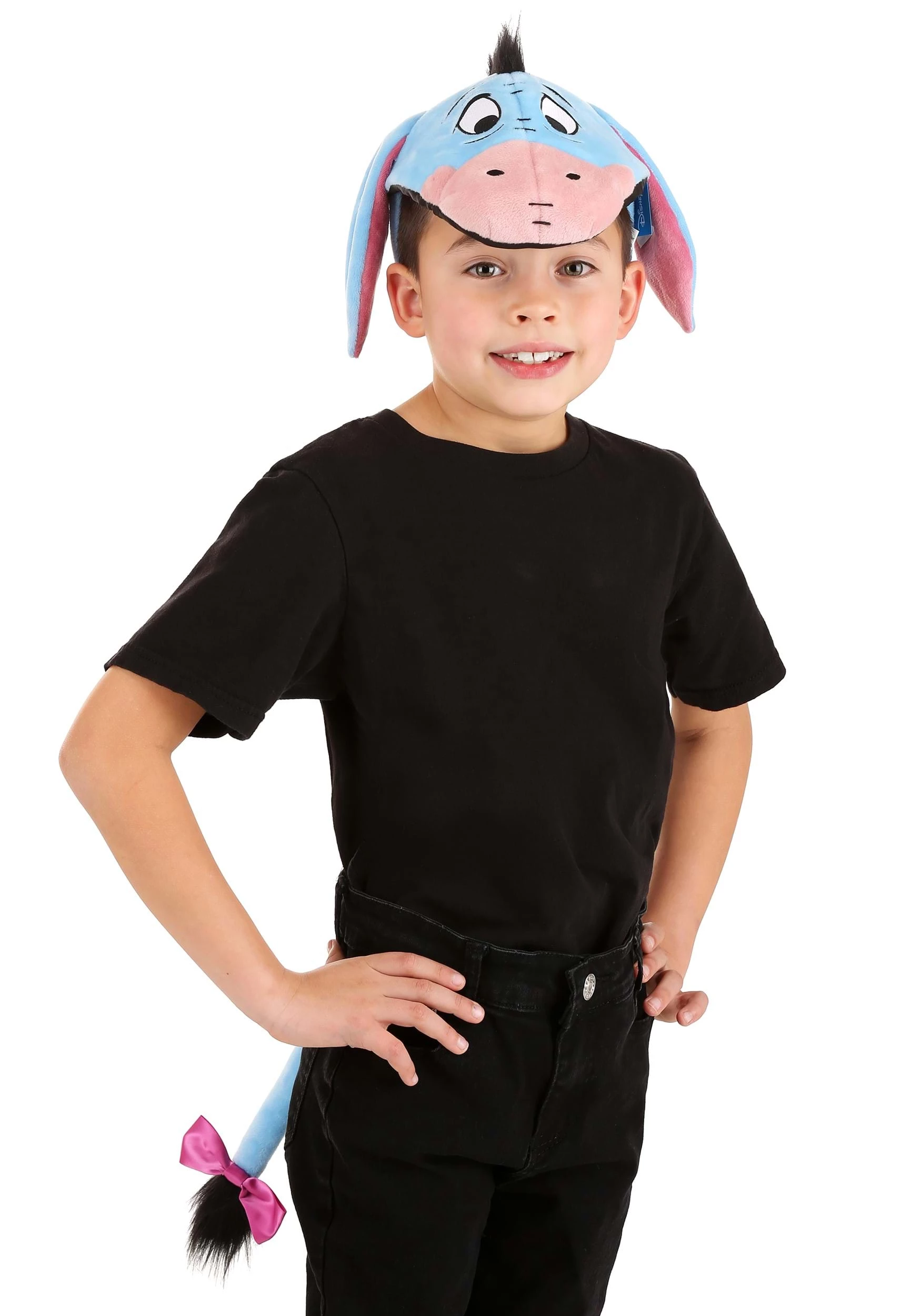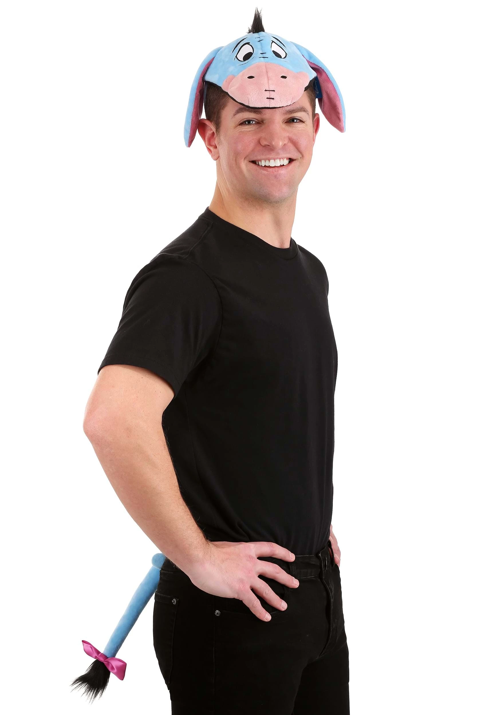 - Fabric-covered plastic headband has foam-backed Eeyore face, soft floppy ears